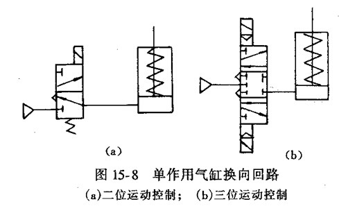 力士樂液壓泵電磁閥控制的換向回路,通電時,活塞桿伸出;斷電時,在彈簧力作用下活塞桿縮回。圖所示為由三位五通閥電-氣控制的換向回路,該閥具有自動對中功能,可使氣缸停在任意位置,但定位精度不高、定位時間不長。