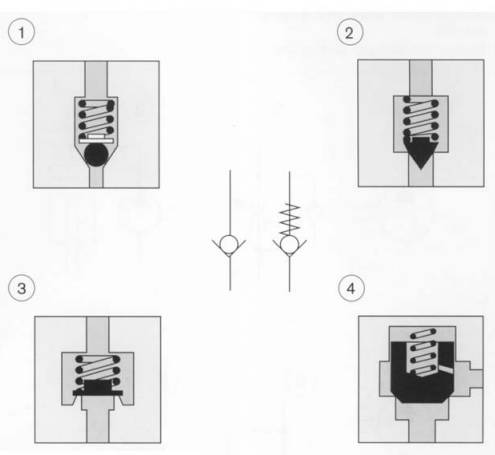 單向閥(止回閥)的主要功能是在一個方向阻止油液的流動,而在反方向則實現自由流動。阻止流動必需無泄漏,因而這類閥總是采用座閥結構。密封元件有鋼球(1),錐閥芯(2),閥座(3)和插裝閥(4)幾種類型。只需很小的液壓力,密封元件就可克服彈簧力而開啟閥門。圖1表示這一基本原理。